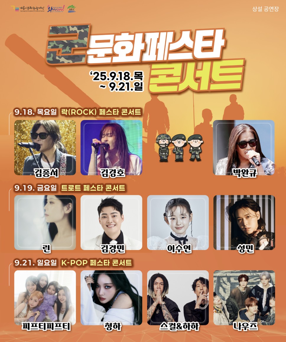 ํ๋ คํ ๊ฐ๋ง์๊ณผ ํจ๊ป ๊ตฐ์ ๋, K-POP, ํธ๋กํธ, ๋ก ๊ณต์ฐ ๋ฑ ๋ค์ํ ๋ฌด๋๊ฐ ํผ์ณ์ง๋๋ค. - ๊ตฐ๋ฌธํ ์ฝ์ํธ
