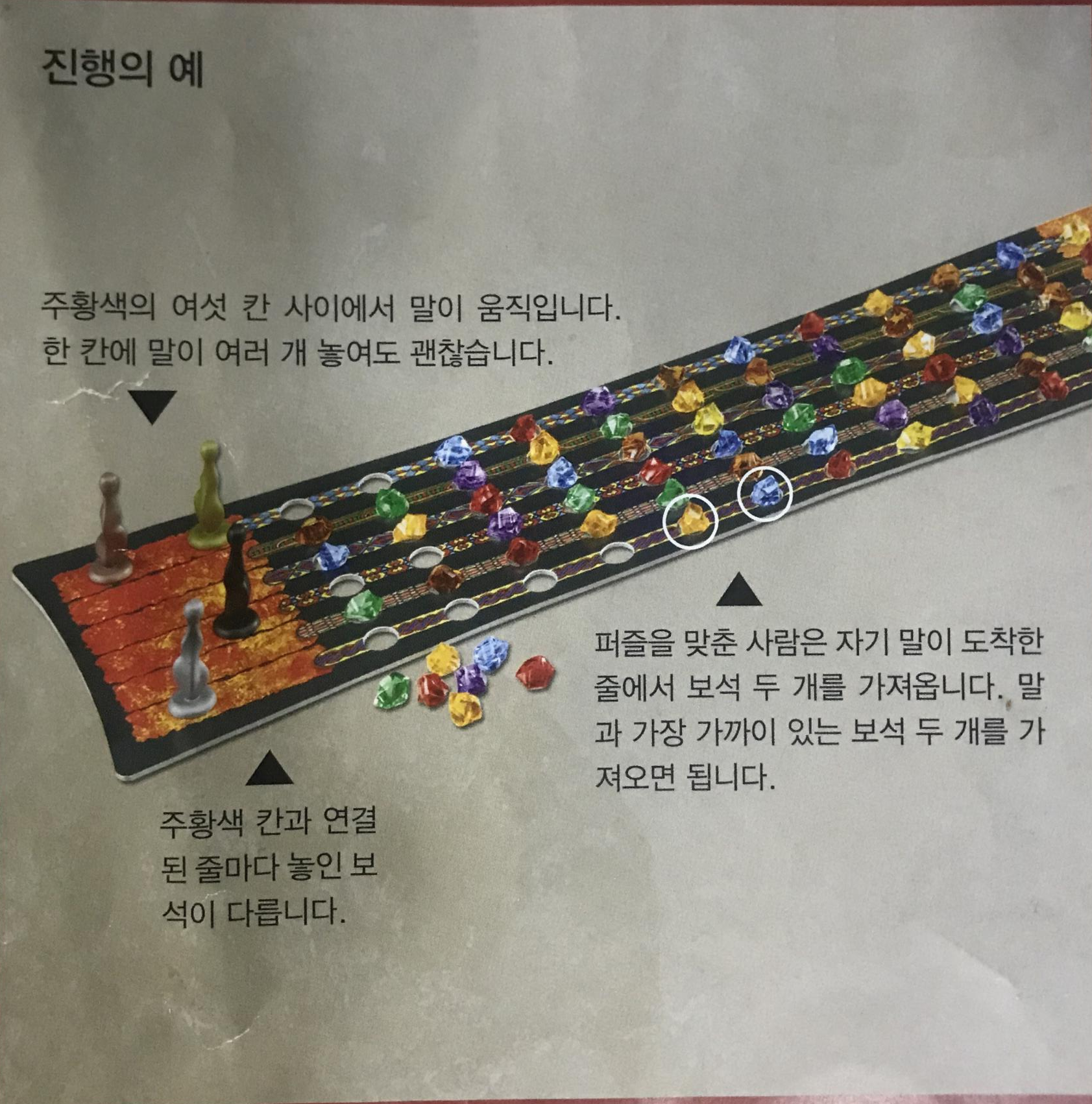필요한 색깔 보석을 얻기 위해 자기 말을 어떤 칸에 놓을 지 잘 생각해야 합니다. 각각의 주황색 칸과 연결된 줄에 어떤 색깔의 보석이 있는지 주의해서 봐야합니다.