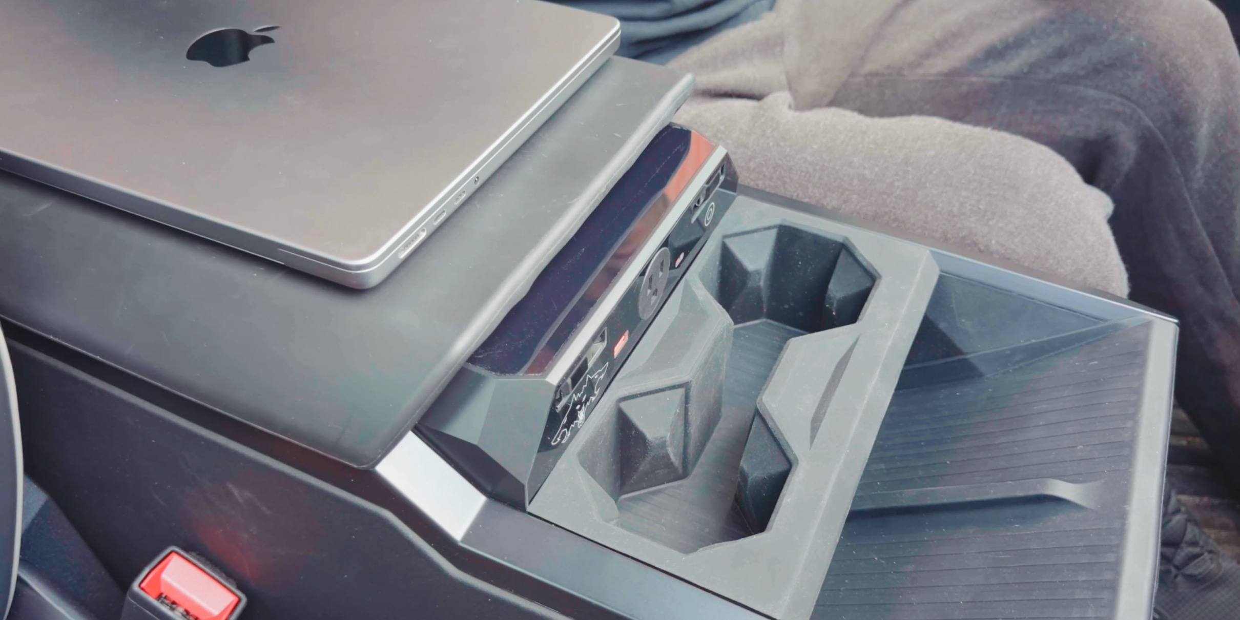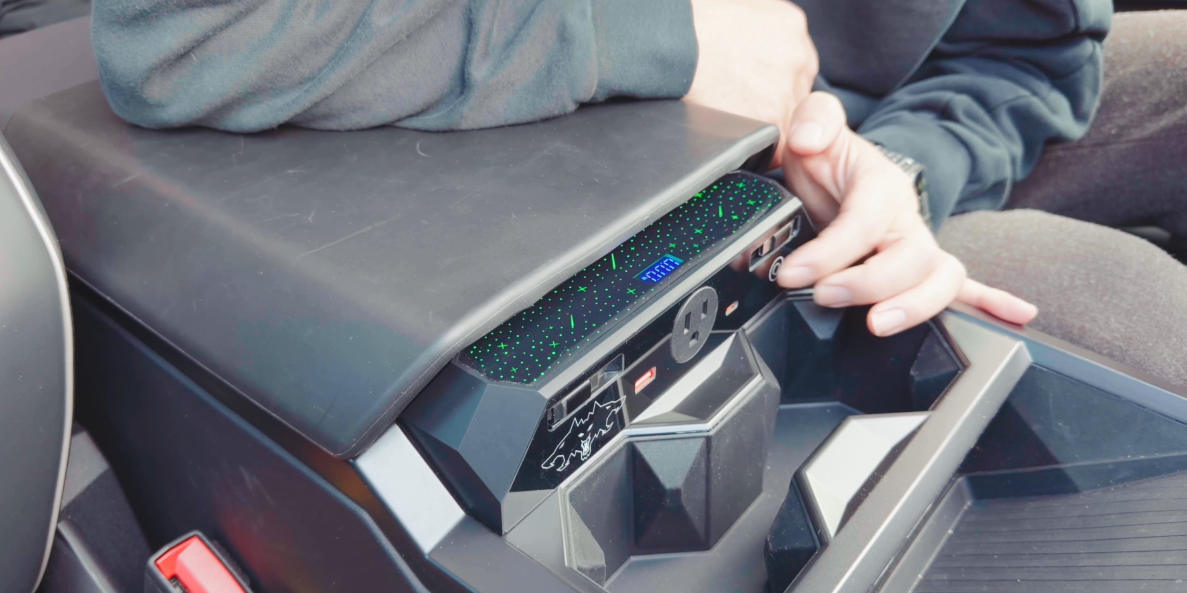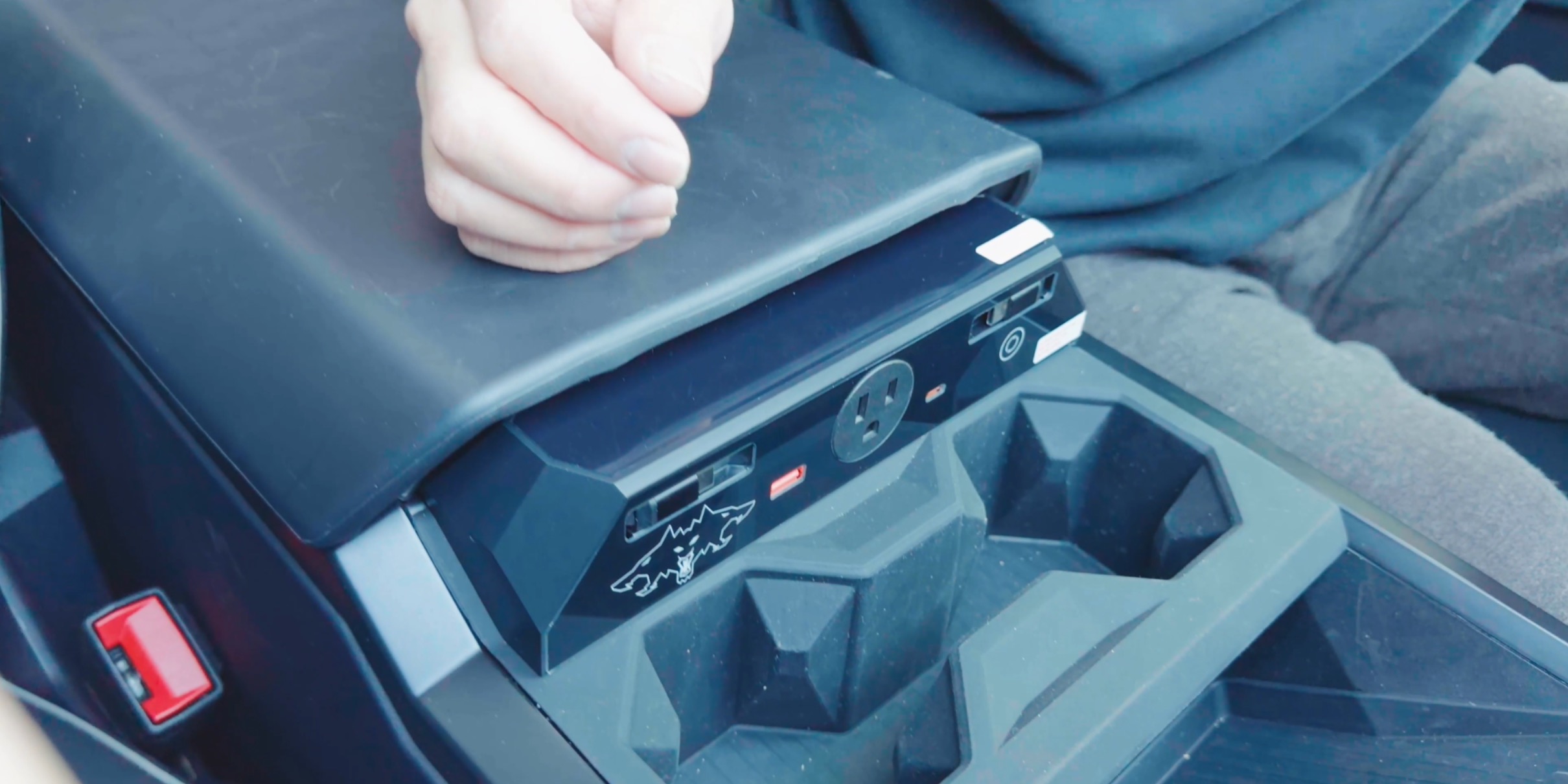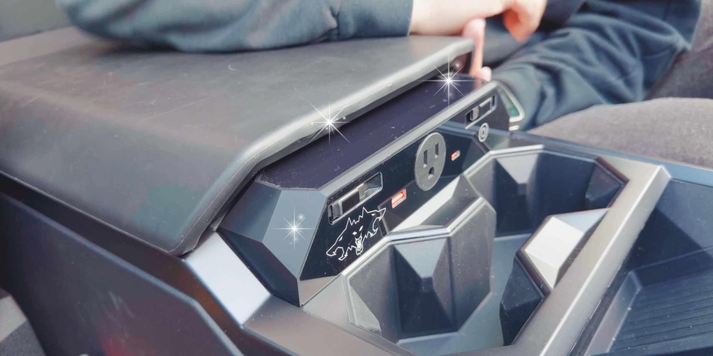 Center console charger hub for the Tesla Cybertruck with 110V AC and USB ports. Includes ambient lighting for easier use and a clean, upgraded interior look.