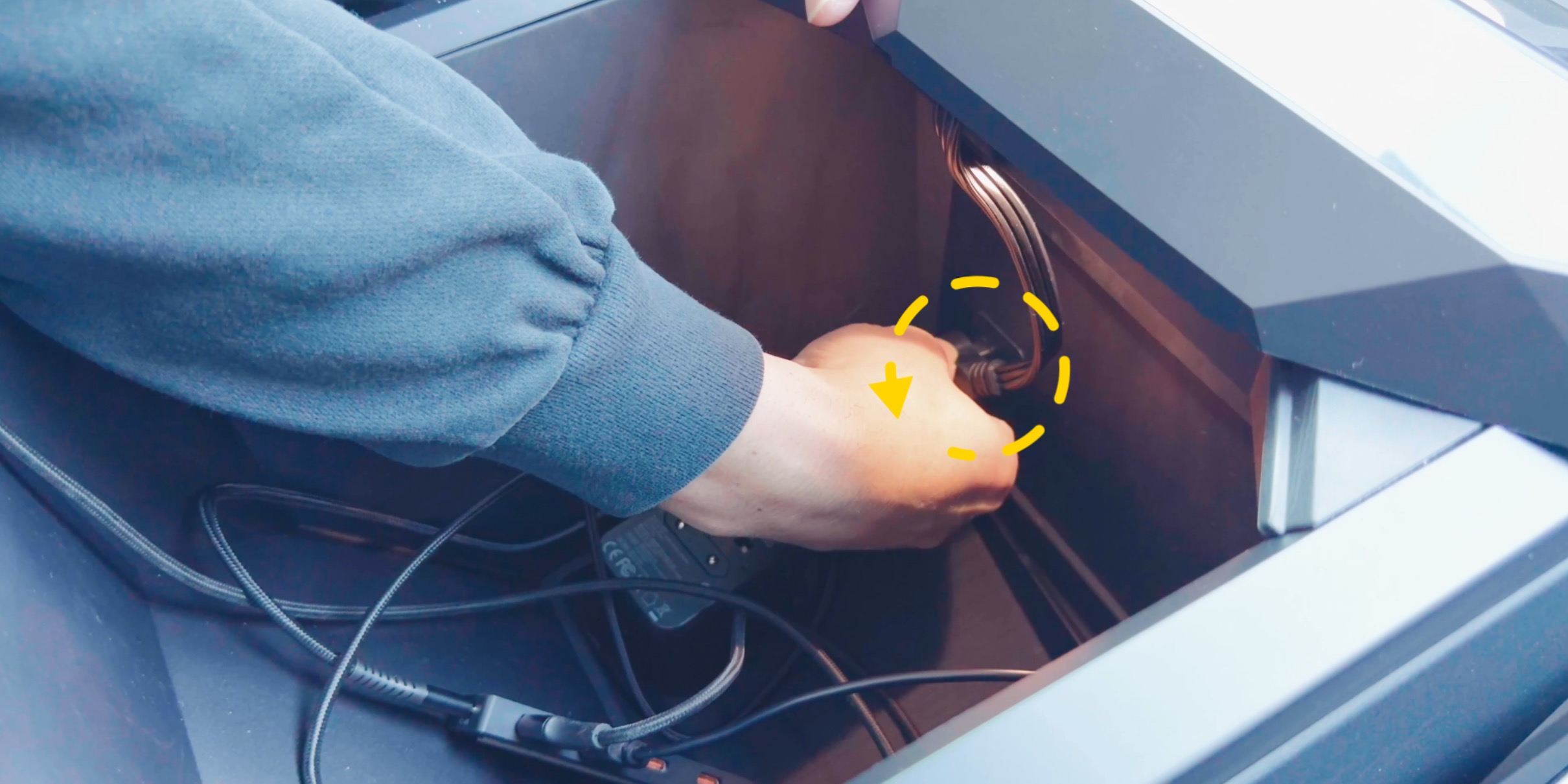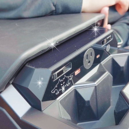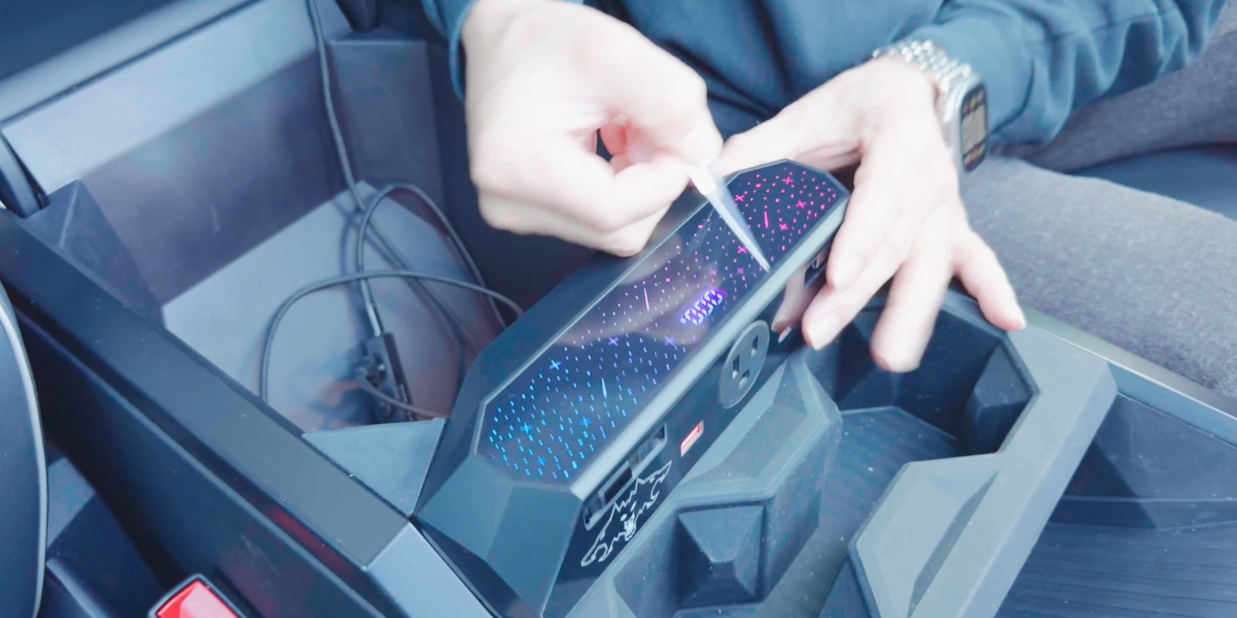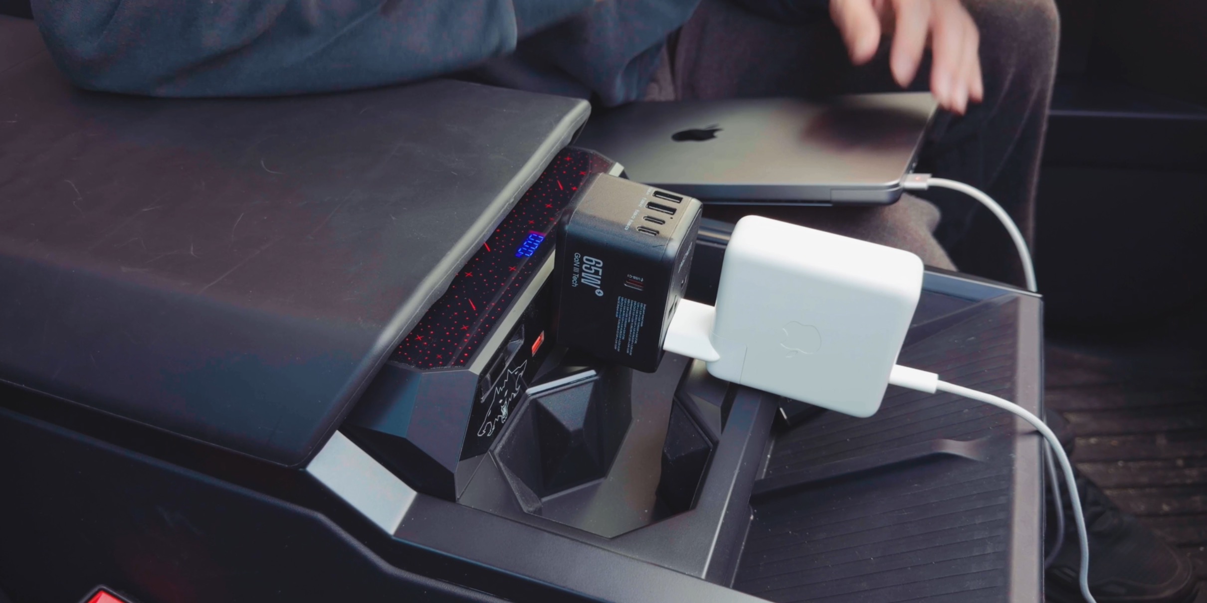 Center console charger hub for the Tesla Cybertruck with 110V AC and USB ports. Includes ambient lighting for easier use and a clean, upgraded interior look.